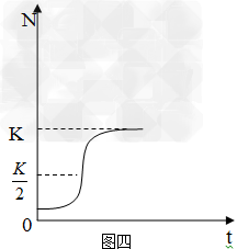 当种群生活于一个有限的自然环境中时,随着种群密度的上升,个体间的种内斗争加剧,天敌数量增多,从而使种群的出生率下降,死亡率上升,则种群的增长率下降;当种群数量达到环境允许的最大值(K)时,种群数量将停止增长,或在K值左右保持相对稳定。假定种群增长率随种群密度的增加而按一定比例下降,种群数量达到K值后保持稳定,种群的增长方式用坐标曲线表示出来就会呈“S”形(图四)。生态学家通过实验所得的结果也与此相符合。