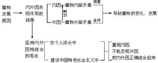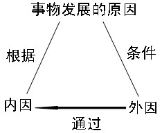 唯物辩证法认为,内因即事物的内部矛盾,外因即事物的外部矛盾。事物的变化发展主要是由事物的内部矛盾引起的,事物内部的矛盾双方既相互依赖又相互斗争,由此使矛盾双方的力量和地位发生变化,从而推动事物的运动变化发展。内因,的确是事物变化发展的根据,是事物发展的源泉,决定着事物的性质和发展方向。但内因的这种作用还只是事物变化发展的可能性,仅有内因事物也不可能发展,还必须要有外因。只有具备了一定的外部条件,才能实现事物变化发展。这是因为,任何事物不是孤立的,都和周围的其他事物相互联系、相互制约和相互影响,周围的事物是该事物存在和发展的条件,失去这些周围事物,该事物就失去了自身存在和发展的条件。所以,事物发展不可能离开外因,外因是事物变化发展不可缺少的条件,外因对事物的变化发展能够起加速或延缓作用,有时甚至还起着非常重大的作用。可见,事物的发展是内因和外因共同起作用的结果。