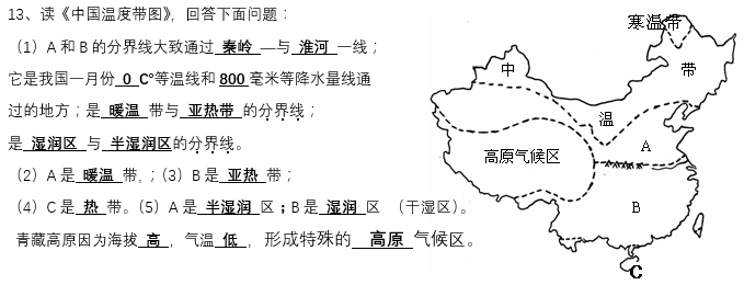 1.我国气候的基本特征:①(大陆性)季风气候显著;②气候复杂多样。