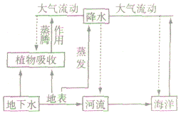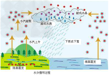在太阳能和地球表面热能的作用下,地球上的水不断被蒸发称为水蒸气,进入大气,水蒸气遇冷又凝聚成水,在重力的作用下,以降水的形式落到地面,这个周而复始的过程。