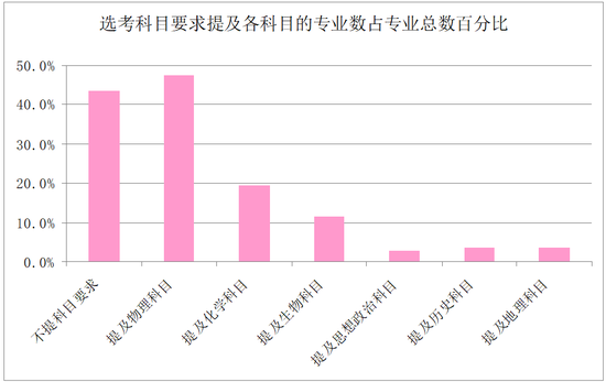 选考科目要求提及各科目的专业数占专业总数百分比如下图所示: