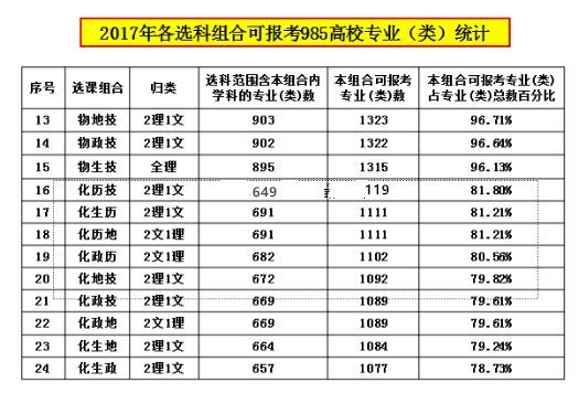 上述为浙江省2019年选考科目可以报名985高校(双一流高校)的情况。在物理很吃力的情况下,很明显看出,两文一理和两理一文的选择成为受众面最广的情况:如化学、历史、地理的搭配达到了81.21%,化学、政治、地理也达到了79.61%,因此,对于学习成绩一般的同学来说,化学真真是一个不错的选择哟!
