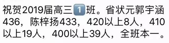 天一中学高三(1)班的郭宇涵考出436分的高分,其中语文127分,数学196分,外语108分,物理、化学双A+,“小高考”加5分。
