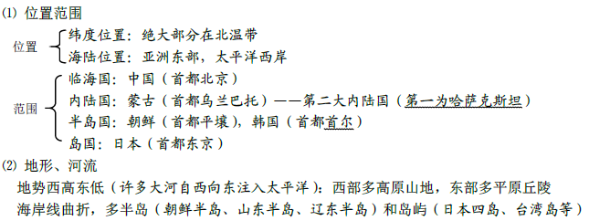 东部沿海地区:自然条件优越,平原多,耕地比重大,气候温暖湿润,利于农业发展,沿海港口多,交通便利,人口众多,劳动力充足,历史悠久,科技文化水平高,为经济发展提供了极其有利的条件,现已出现很多工农业发达的地区,是世界上主要的水稻、蚕丝、茶叶的产地。日本是世界的工业大国、现代工业发达的国家,此外韩国、中国的东部沿海地区、台湾省、香港地区等经济发达区和新兴工业区不断形成。