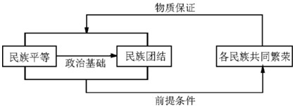 | 含义 | 各民族一律平等,都依法平等地享有政治、经济、文化和社会等方面的权利,依法平等地履行应尽的义务 | 我国形成了各族人民和睦相处、友好往来、互相合作、共同奋斗,谁也离不开谁的大团结局面 | 实现各民族共同发展、共同富裕、共同繁荣 | |