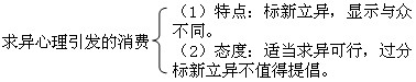 | 求异心理引发的消费 | 标新立异、追求与众不同的效果 | 有时可推动新工艺和新产品的出现 | 过分标新立异代价大,社会不一定认可 | 为显示与众不同而过分标新立异,是不值得提倡的 |