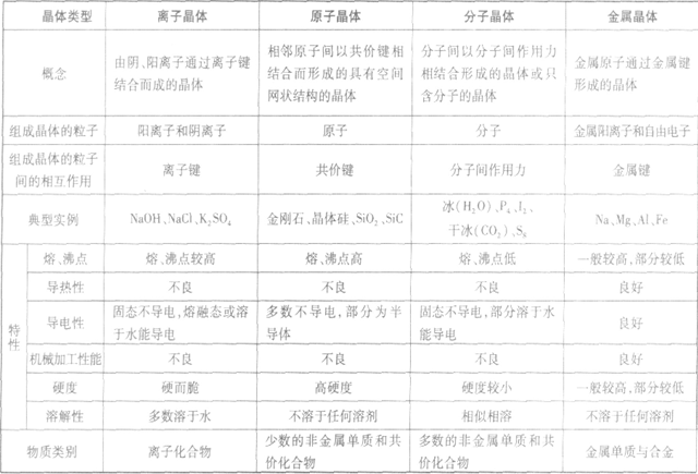 (1)不同类型晶体的熔、沸点高低规律:一般,原子晶体>离子晶体>分子晶体。金属晶体的熔、沸点有的很高,如钨、铂等;有的则很低,如汞、铯等。