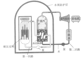 第一回路中的水被泵压入反应堆,通过堆芯时利用核反应放出的热来增加水的内能,水的温度升高。第一回路的水进入热交换器,把热量传给第二回路的水.然后又被泵压回到反应堆里。在热交换器内,第二回路中的水被加热生成高温高压蒸汽,驱动汽轮机运转。