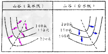(1)水系特征:山地常形成放射状水系;盆地常形成向心状水系;山脊常形成分水岭(山脊处等高线弯曲最大处的连线称分水线);山谷常有河流发育,等高线穿越河谷时向上游弯曲,即河流流向与等高线凸出方向相反。