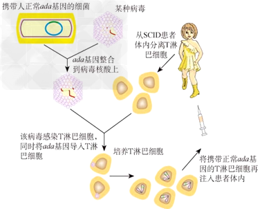 (3)基因治疗的步骤:选择治疗基因→将治疗基因和运载体结合导入到患者体内→治疗基因在细胞内正常表达。