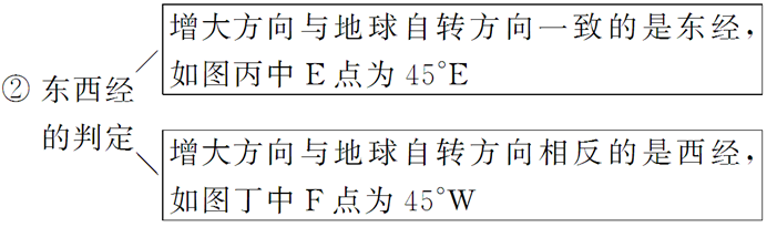 ①南北纬的判定:在极地经纬网图上,各点所属的南、北纬度应由图中极点来确定。若极点为北极点,则以该极点为中心的半球范围内,各点纬度均为北纬度;相反,则为南纬度。如图丙中E点为30°N,图丁中F点为30°S。