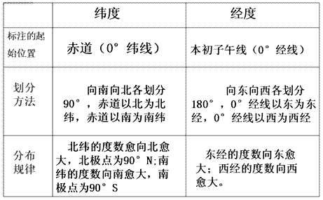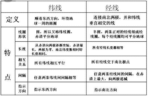 (1)纬线:顺着东西方向,环绕地球一周的圆圈。