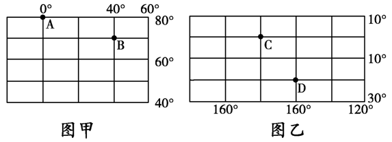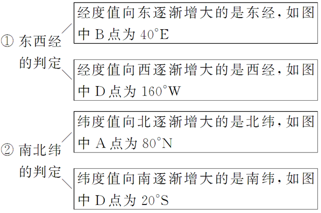 ③度数的判定:在同一幅经纬网图中相邻两条纬线之间的纬度间隔、相邻两条经线之间的经度间隔一般都是相等的。图中A点为(80°N、0°);B点为(70°N、40°E);C点为(0°、180°);D点为 (20°S、160°W)。