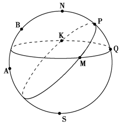 (2)同一纬线上的两点,其最短距离的劣弧线向较高纬度凸起(如图中同一条纬线上MK之间的最短航线是弧MPK,而不是弧MQK,赤道上除外)。