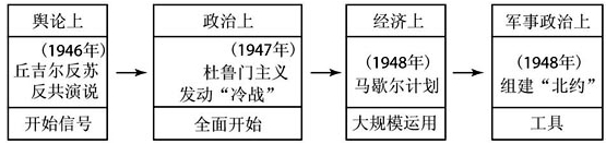 (1)含义:指以美国为首的西方资本主义国家,对苏联等社会主义国家采取的除武装进攻以外的一切敌对行动,以“遏制共产主义”。