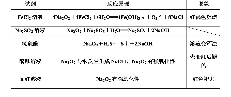 | 与HCl反应 | Na2O+2HCl=2NaCl+H2O | 2Na2O2+4HCl=4NaCl+2H2O+O2↑ |