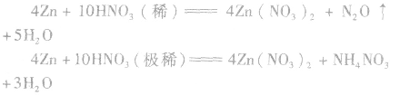等,这取决于硝酸的浓度和还原剂还原性的强弱。除前面的实例外,锌与硝酸可发生如下反应: