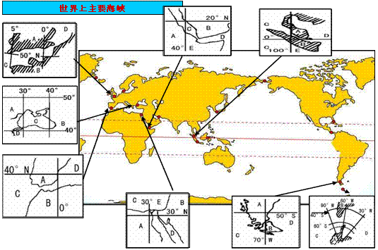 1、海峡:沟通两个海洋之间的狭窄水道.