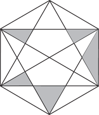 2、下图中的六边形木板被木匠勾了很多墨线,有阴影的小块是木匠预备裁掉的。用30秒记住这些阴影块,然后翻页尾,仅凭记忆在空白木板上涂出阴影块。