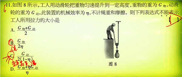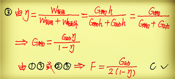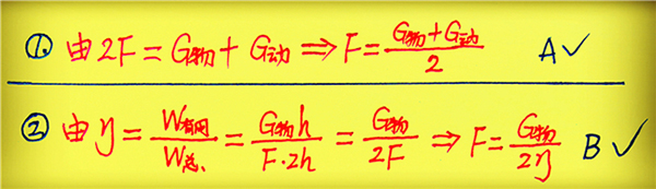 这两个公式分别对应A、B两个选项,第一个公式是从力的角度解答绳端的拉力大小,这几乎是所有学生都能想到的答案。第二个公式是从机械效率的角度解答,这个公式也是学生们必须熟练掌握运用的公式,错误较少。