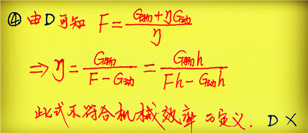我们可以采用另外一种反证的办法,假定D是正确的,然后通过变形解出机械效率表达式,观察最终结果可以看出来,此公式根本不符合机械效率的定义,所以不成立!D错误!