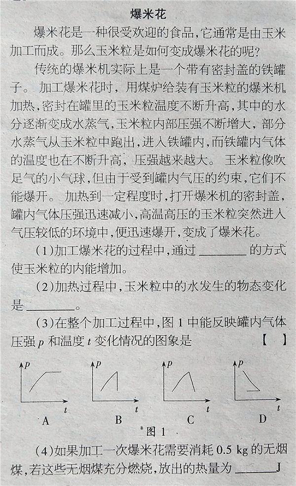 下面这道中考物理题是有关“爆米花”的物理信息题,请先看一下。